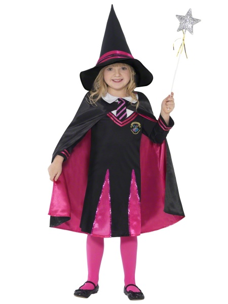 Kostium małej czarodziejki z Hogwardu zawiera czarno-różowy strój, płaszcz i kapelusz na głowę.