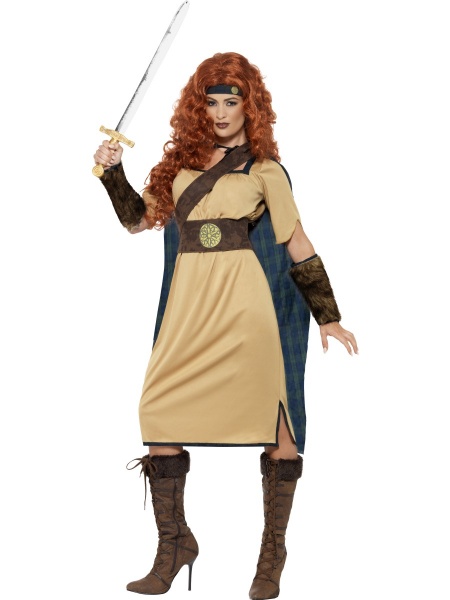 Kostium Wojowniczej Królowej zawiera sukienkę, opaskę, pelerynę, pas i osłony na rękę.