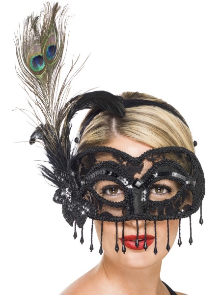 Maska Kolombine z czarnym pawim piórem i czarnymi koronkami bogato zdobionymi jest idealnym dodatkiem do sukni, jeśli wybieracie się na bal przebierańców lub bal maskowy.