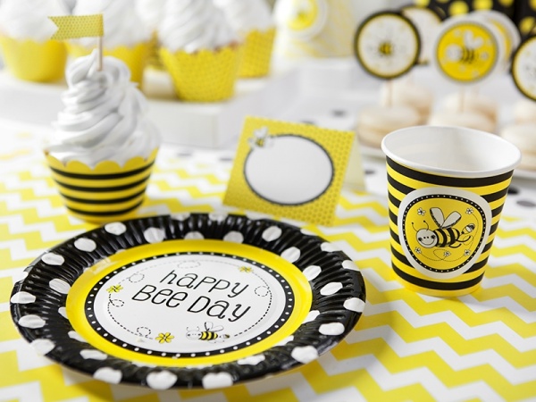 Wytłaczane talerzyki papierowe - Pszczółka. Wokół są białe kropki na czarnym tle.