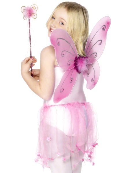 Ten dziecięcy zestaw dla wróżki zawiera małe różówe skrzydła, różówą sukienkę i różdżkę.